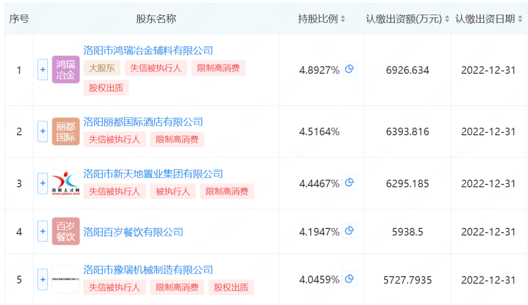 伊川农商行股权颠倒散布,最大的鼓励洛阳市鸿瑞冶金辅料有限公司也仅合手股4.9%,而且前五大鼓励,也曾有4个成了失信被践诺东谈主。