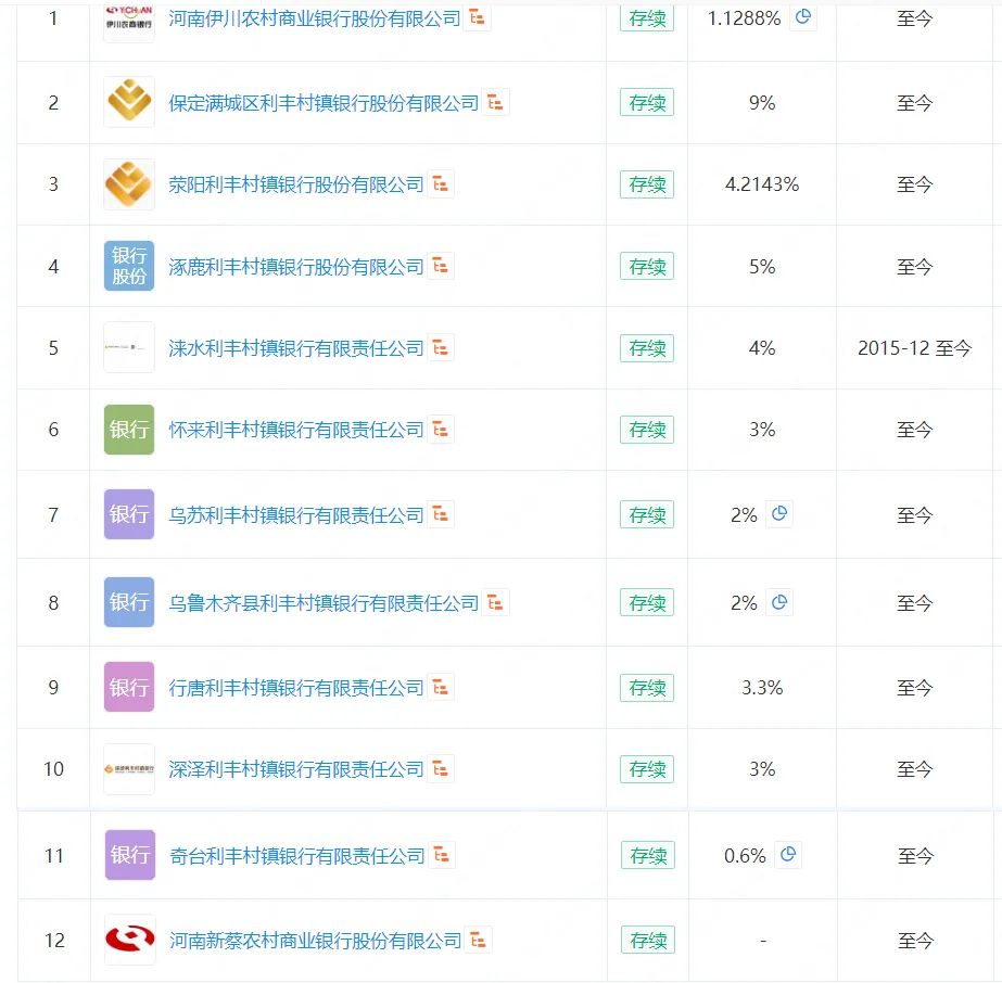 除了伊川农商行,康凤利还入股河南新蔡农商行、河南荥阳利丰村镇银行、新疆奇台利丰村镇银行、河北涞水利丰村镇银行等11家农商行或村镇银行。